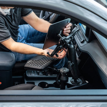This swing arm mount features a RAM® Tele-Pole™ 8” upper pole with flange, 6” swing arm, and a long C size double socket arm. Easily connect any RAM® lower pole, RAM® tablet mount or holder to the flange double ball mount and connect our GDS® Keyboard™ to the swing arm system to complete the ultimate mobile workstation. With the ability to swing the keyboard out of the way when not in use as well as position the monitor at nearly any angle, ensure your mobile workstation is backed by RAM® Mounts for strength, durability, and versatility.