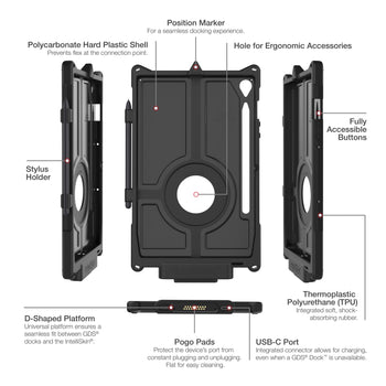 The IntelliSkin® Next Generation protective sleeve for the Samsung Galaxy Tab S9, S9 FE & S10 FE includes all the great features of the original IntelliSkin® while adding several enhancements. An insert molded redesign of the skin combines a hard plastic shell with soft, shock-absorbing rubber. Ruggedized contacts for repetitive docking in field applications remain on the exterior, but are now flat to collect less dirt and allow for easier cleaning. And an integrated USB Type-C connector at the bottom of the skin allows for device charging even when you don’t have a GDS® Dock™ available. Like the original IntelliSkin®, these sleeves still provide military-grade drop protection and prevent damage to your device’s charging port from constant docking with an integrated GDS® connector molded directly into the skin. The IntelliSkin® Next Generation for the Samsung Galaxy Tab S9, S9 FE & S10 Fe is compatible with a variety of GDS® Docks™ and accessories, as well as new docking cups for upgrading existing GDS® vehicle docks. Always Protected. Always Connected.®