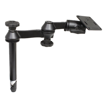 The RAM-VP-SW1-8-2461 consists of a 8" upper male Tele-Pole™, double swing arm and 3.625" square base that contains the VESA hole pattern. The Tele-Pole™ can be easily adjusted by turning the knob at the top of the post. Once the knob has been tightened, the Tele-Pole™ becomes a rigid support for connecting devices or cradles. The Tele-Pole™ will connect to any RAM vehicle base with a welded female Tele-Pole™. The double swing arm with rotating plate, allows you to twist and tilt the viewing angle of your connected electronic device, when mounted on your RAM Vehicle Mount. The rotating swivel arm gives you even more viewing positions for your mounted electronic device while holding everything firmly in place. The length of the double swing arm is 12". The 3.625" square base includes a 75mm X 75mm VESA hole pattern with 1.5" rubber ball positioned 0.88" from the center of one edge.