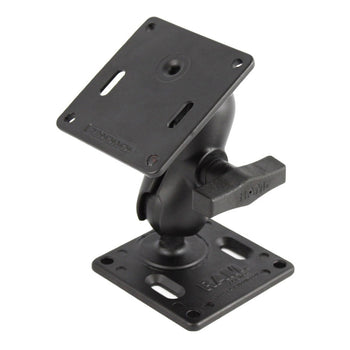 The RAM-102U-B-2461 consists of a SHORT double socket arm and 3.625" square plate with VESA hole pattern. The VESA plate contains 75x75MM hole patterns. The rubber ball is positioned 0.88" from the center of one edge.