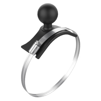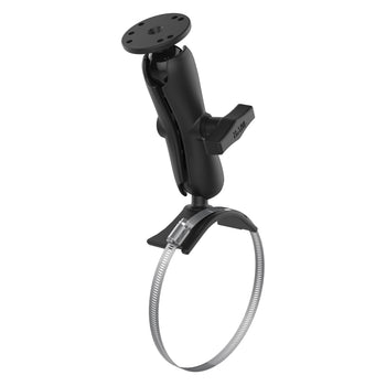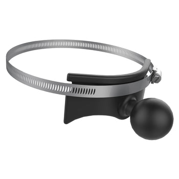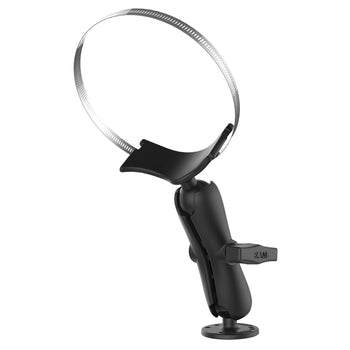 The RAM-118U consists of a double socket arm, 2.5" diameter round base with the universal AMPS hole pattern and large "U" shaped cradle that can strap around a 4" to 5.5" pipe. Originally design for strapping to a lantern base, this mount can also be used as a base to strap to a round rail.
