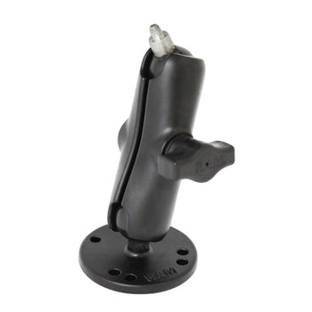The RAM-B-101-237U consists of a double socket arm, 2.5" diameter round base and 1" diameter rubber ball, connected to a 1/4"-20 camera thread. The male thread matches most standard camera and camcorder female threads found on the bottom of the camera. The round base contains pre-drilled holes, including the universal AMPs hole pattern. Designed into the mount is a 1" diameter patented rubber ball and socket system with adjustment points at both ends of the socket arm; this with a twist of the arm knob, allows for infinite articulation and optimum viewing angles.