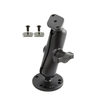 The RAM-B-138-TR1 consists of a 2.5" diameter round base with the universal AMPS hole pattern, double socket arm, diamond base adapter and mounting hardware. The mount is designed with a RAM 1" diameter patented rubber ball and socket system that has adjustment points at both ends of the double socket arm; this allowing for almost infinite adjustment and perfect viewing angles.