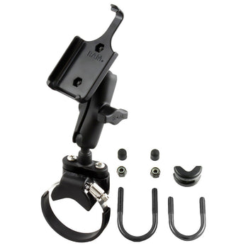 The RAM-B-149Z-2-AP9 consists of a steel strap base, u-bolt bases, double socket arm, diamond adapter base and high strength composite cradle for the Apple iPhone 4. The mount is designed with a RAM 1" diameter patented rubber ball and socket system that has adjustment points at both ends of the double socket arm; this allowing for almost infinite adjustment and perfect viewing angles. Designed for a clean installation, the RAM strap mount will accommodate most common roll bar sizes on UTV’s, allowing for the placement of the RAM rubber ball base. This mount can also be attached to smaller diameter handlebars on ATVs using the included hardware.