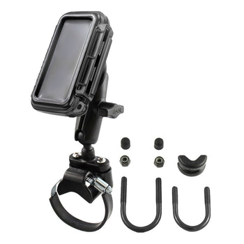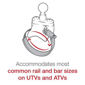 RAM UTV/ATV strap mount with small size AQUA BOX®. The mount is designed with a RAM 1" diameter patented rubber ball and socket system that has adjustment points at both ends of the double socket arm; this allowing for almost infinite adjustment and perfect viewing angles. The clear, touch through screen allows you to view your electronics as well as use their function keys while in place. There is even a place for a small lock to serve as a theft deterrent. The strap base accommodates rails from 40mm (Min) to 80mm (Max) in diameter.