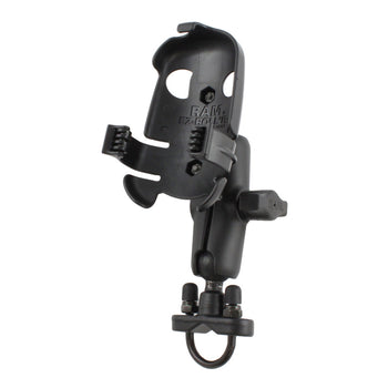 The RAM-B-149Z-MA14 consists of a double socket arm, zinc coated u-bolt base, diamond adapter base and custom high strength composite cradle for the Magellan eXplorist 510, 610 and 710. Designed into the mount is a 1" diameter patented rubber ball and socket system with adjustment points at the base and cradle. With a twist of the arm knob, you can move the Magellan eXplorist motorcycle mount to your optimum viewing position. Included in this package is hardware that will accommodate rails from 0.50" to 1.25" in diameter. Also included are black cover caps to be placed over the exposed ends of the u-bolt and a composite adapter that can narrow the rail to a minimum width of 0.5".