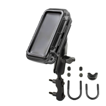 The RAM-B-174-AQ2U consists of a hardware for mounting to both brake/clutch reservoirs and rails that are 0.5" to 1.25" in diameter, double socket arm, 2.5" diameter round bases with the universal AMPS hole pattern and sealed enclosed medium size AQUA BOX®. The mount is designed with a RAM 1" diameter patented rubber ball and socket system that has adjustment points at both ends of the double socket arm; this allowing for almost infinite adjustment and perfect viewing angles. The AQUA BOX® case provide sealed enclosure and protection for your handheld device. The clear, touch through screen allows you to view your electronics as well as use their function keys while in place. There is even a place for a small lock to serve as a theft deterrent. The mounting hardware for brake/clutch reservoirs include both standard and metric mounting bolts.