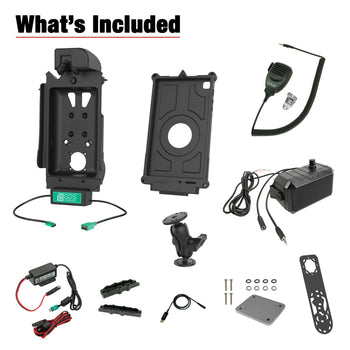• Bundle includes the GDS® Tough-Dock™, IntelliSkin® Next Gen for Samsung Tab A7 Lite 8.7", GDS® Modular 10-30V Hardwire Charger, C Size double ball mount with short arm, backing plate adapter, bracket adapter, audio adapter cable (3.5mm to USB Type-A), GDS® Audio™ amplified speaker, RAM® microphone, and cable clamps
