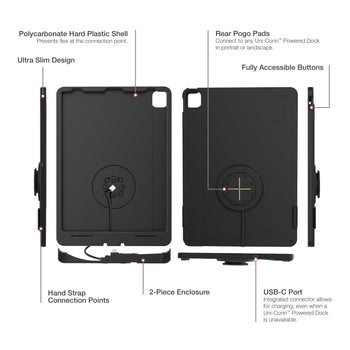 - Two-piece, hard plastic enclosure for Apple iPad Pro 12.9 (3rd-6th Gen) with integrated GDS® Uni-Conn™ adapter with rear pogo pads