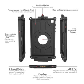 The IntelliSkin® Next Generation protective sleeve for the Samsung Galaxy Tab A 8.4 (2020) includes all the great features of the original IntelliSkin® while adding several enhancements. An insert molded redesign of the skin combines a hard plastic shell with soft, shock-absorbing rubber. Ruggedized contacts for repetitive docking in field applications remain on the exterior, but are now flat to collect less dirt and allow for easier cleaning. An integrated USB Type-C connector at the bottom of the skin allows for device charging even when you don’t have a GDS® Dock™ available. Like the original IntelliSkin®, these sleeves still provide military-grade drop protection and prevent damage to your device’s charging port from constant docking with an integrated GDS® connector molded directly into the skin. The IntelliSkin® Next Generation for the Samsung Galaxy Tab A 8.4 (2020) is compatible with a variety of GDS® Docks™ and accessories, as well as new docking cups for upgrading existing GDS® vehicle docks. Always Protected. Always Connected.®