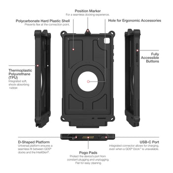 The IntelliSkin® Next Generation protective sleeve for the Samsung Galaxy Tab A7 Lite 8.7" (SM-T220 & SM-T225) includes all the great features of the original IntelliSkin® while adding several enhancements. An insert molded redesign of the skin combines a hard plastic shell with soft, shock-absorbing rubber. Ruggedized contacts for repetitive docking in field applications remain on the exterior, but are now flat to collect less dirt and allow for easier cleaning. And an integrated USB Type-C connector at the bottom of the skin allows for device charging even when you don’t have a GDS® Dock™ available. Unique to this IntelliSkin® is a cut out to gain access to the audio jack, located on the bottom left side of the IntelliSkin®. Like the original IntelliSkin®, these sleeves still provide military-grade drop protection and prevent damage to your device’s charging port from constant docking with an integrated GDS® connector molded directly into the skin. The IntelliSkin® Next Generation for the Samsung Galaxy Tab A7 Lite 8.7" (SM-T220 & SM-T225) is compatible with a variety of GDS® Docks™ and accessories, as well as new docking cups for upgrading existing GDS® vehicle docks. Always Protected. Always Connected.®