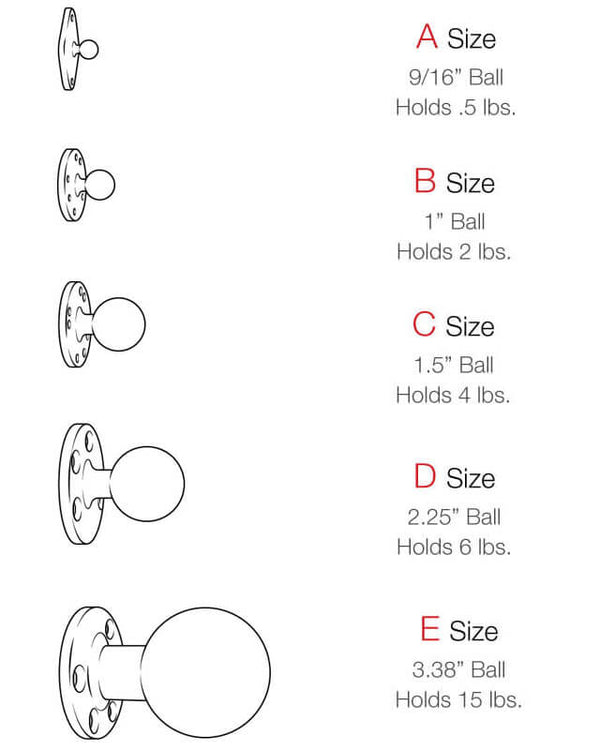 The weight limits below are a guide only. All factors in a planned mounting configuration should be considered to choose the most suitable ball size.