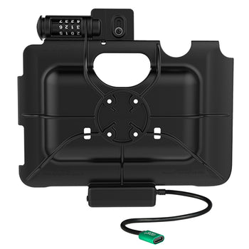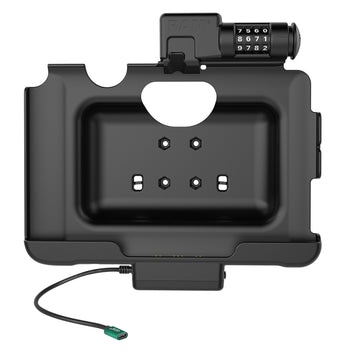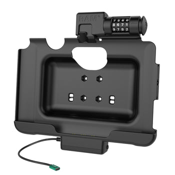 This powered cradle for the Samsung Galaxy Tab Active5 Pro, Tab Active4 Pro, and Tab Active Pro has been designed to meet the demands of field workers in a variety of applications including transportation, field sales, logistics, manufacturing, and much more. Power capabilities are provided to the device through pogo pins, and you can easily rotate the device for use in portrait or landscape mode. For security and theft deterrence, this powered cradle features a combination lock that’s compatible with the RAM® Skin™ or factory device skin, as well as GDS® Hand-Stand™ and shoulder strap accessories. Access to the stylus remains while the device is docked. Included is a set of four nuts and bolts to connect the cradle to any RAM® components containing the universal AMPS hole pattern.