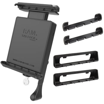 Almost everyone wants a tablet pc so don't let someone get yours for free. Keep it safe with the new RAM locking Tab-Lock™ tablet cradle. This product is sure to make most would-be thieves think twice about trying to steal yours. Our easy to use locking cradle not only looks great and performs flawlessly, but it is compatible with RAM's full line of mounting solutions ideally suited for personal and fleet use. Spring loaded and form fitting, this compact yet durable cradle won't take up a lot of space yet provides loads of security. With the new Tab-Lock™ tablet cradle, RAM lets you keep your tablet where it belongs...in your possession. Included is a set of four nuts and bolts to connect the cradle to any RAM components or mounts that contain the universal AMPs hole pattern.