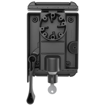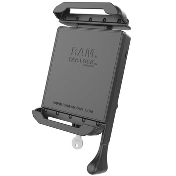 The RAM® Tab-Lock™ spring loaded, quick release cradle with a keyed lock offers a secure fit with easy access to the mounted tablet. The keyed lock offers theft deterrence and unwanted tampering in public settings. The interchangeable cup ends are designed specifically for the Samsung Galaxy Tab 4 7.0 with an Otterbox Defender case. The spring loaded design makes it easy to insert and remove your tablet, along with keeping it secure in mobile applications. The custom end cups are designed to optimize the functionality of your tablet, enabling access to all ports and tablet functions. The included back plate is interchangeable with various size support cups, making it compatible with numerous tablet models. New detachable support cups are the only components needed for purchase, attach to the back plate for support of your new tablet. Included is a set of four nuts and bolts to connect the cradle to any RAM components or mounts that contain the universal AMPs hole pattern. The Tab-Lock™ cradle is compatible with any tablet that will fit the dimensions listed below. It is important to verify the dimensions of your tablet when determining the overall size. Note: Product consists of holder only. Case not included.