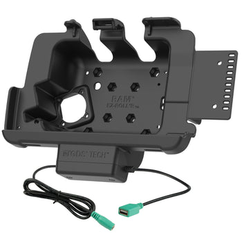 Featuring data and charging capabilities, the RAM® Tough-Dock™ for Zebra ET40 & ET45 8" enterprise tablets with Rugged Frame allows you to connect a desired peripheral while keeping the device charged through the pogo pin contacts when the device is docked. Power is provided by connecting to the dock's 5.5mm DC power jack, while peripheral support is provided by the built-in USB Type-A cable. The dock also allows the tablet's scanning function to work on the side, as well as tablet add-ons such as the Zebra Expansion Back and PowerPack Battery. This vehicle dock is compatible with C and D size RAM® 4-hole AMPS and 75mm x 75mm VESA pattern bases for attaching a double socket arm in order to complete your mounting solution. Take the solution a step further by taking advantage of the built-in 2-hole mounting plate compatible with RAM® 2-hole diamond base for additional device mounting such as a phone or other handheld device.