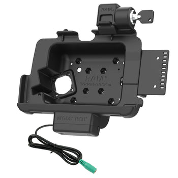 Featuring charging capabilities and a key lock for theft deterrence, the RAM® Tough-Dock™ for Zebra ET40 & ET45 8" enterprise tablets with Rugged Frame allows you to keep the device charged through the pogo pin contacts when the device is docked—power is provided by connecting to the dock's 5.5mm DC power jack. The dock also allows the tablet's scanning function to work on the side, as well as tablet add-ons such as the Zebra Expansion Back and PowerPack Battery. This vehicle dock is compatible with C and D size RAM® 4-hole AMPS and 75mm x 75mm VESA pattern bases for attaching a double socket arm in order to complete your mounting solution. Take the solution a step further by taking advantage of the built-in 2-hole mounting plate compatible with RAM® 2-hole diamond base for additional device mounting such as a phone or other handheld device.