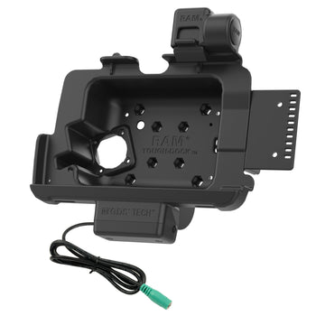 For frequent docking and undocking of the Zebra ET40 & ET45 8" tablets wrapped in a Rugged Frame, this form-fit RAM® Tough-Dock™(RAM-HOL-ZE20PNLLU) features a top latch design for securing the tablet without wear and tear on the dock itself. Power is provided via a 5.5mm DC barrel connector and allows you to keep the device charged through the pogo pin contacts when the device is docked. The dock also includes space in the back for tablet add-ons such as the Zebra Expansion Back, PowerPack Battery, and GDS® Ergo™ accessories like the GDS® Roto-Mag™ and GDS® Hand-Stand™. To mount this dock, pair any C and D size RAM® 4-hole AMPS or 75mm x 75mm VESA pattern bases for attaching a double socket arm in order to complete your mounting solution. Take the solution a step further by taking advantage of the built-in 2-hole mounting plate compatible with RAM® 2-hole diamond base for additional device mounting such as a phone, scanner, printer, or any other handheld device.
