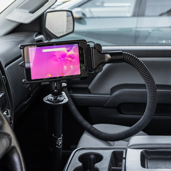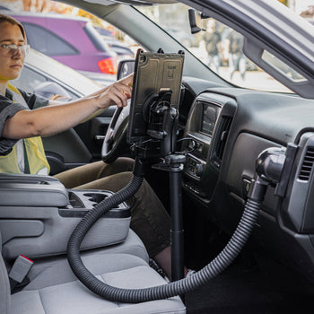 This RAM® Vent-Temp™ temperature module accessory (RAM-VENT2-RCT-50U) installs to the front of any RAM® or GDS® dock and attaches to rectangular A/C vents using included zip ties. This version of the RAM® Vent-Temp™ directs air produced by your vehicle's A/C system to either cool, or heat up the front of the docked phone or tablet. This is ideal for environments where the tablet needs to be cooled off or heated up to maintain operating temperatures during critical work functions, or to defrost the front of the device to keep your touchscreen operable. When installed correctly and vent cover is attached to a rectangular air vent, both the hose adapter and front dock attachment feature integrated magnets for easy break-away when the RAM® Vent-Temp™ is not needed, or gets caught on something that could tug on the hose. The 50" included flexible hose can be cut to the desired length of reach from vent to dock.