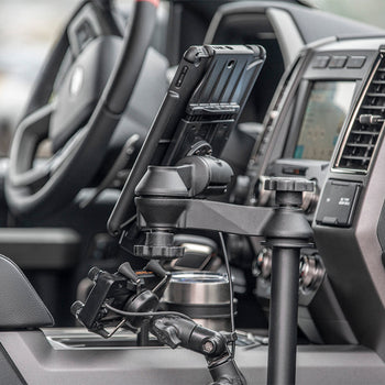 This in-vehicle workstation mount features a RAM® Tele-Pole™ 9” base, RAM® Tele-Pole™ 8” upper pole with flange, 6” swing arm, and a long C size double socket arm. Easily connect any RAM® tablet mount or holder to the flange double ball mount and connect our GDS® Keyboard™ to the swing arm system to complete the ultimate mobile workstation. With the ability to swing the keyboard out of the way when not in use as well as position the monitor at nearly any angle, ensure your mobile workstation is backed by RAM® Mounts for strength, durability, and versatility.