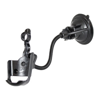 The RAP-105-6224-GA12U, flex arm suction cup mount, consists of a 3.3" suction cup locking base, 6" aluminium flex rod and custom high strength composite cradle for the Garmin GPSMAP. Once the suction base is securely mounted, you can move the cradle to your optimum viewing position with a simple bend of the arm. The suction cup base is designed to have an extra strong hold on any smooth non-porous surface. For best results mount the suction cup to glass or non-porous plastic surfaces.