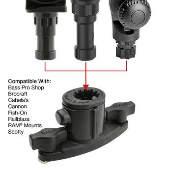 - Universal post and spline base compatible with post and spline systems from RAM® Mounts, Scotty, Fish-On, Railblaza, Cannon, Brocraft, Cabela's and Bass Pro Shops