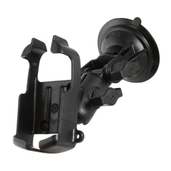 The RAP-B-104-224-GA16U consists of a patented twist lock suction cup base, swivel ratchet arm and custom high strength composite cradle for the Garmin eTrex. Once the suction base is securely mounted, you can move the cradle to your optimum viewing position with a simple bend of the arm. The suction cup base is designed to have an extra strong hold on any smooth non-porous surface. For best results mount the suction cup to glass or non-porous plastic surfaces.
